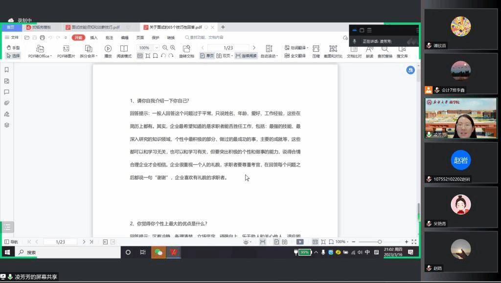接着,凌芳芳同学通过契合自身工作经历,从面试辅导要点、常见问题、着装礼仪、面试态度、薪资商谈等多个方面向同学们展开分享,强调面试其实就是一场表演,并就同学们面试需注意的地方提出相关的建议。