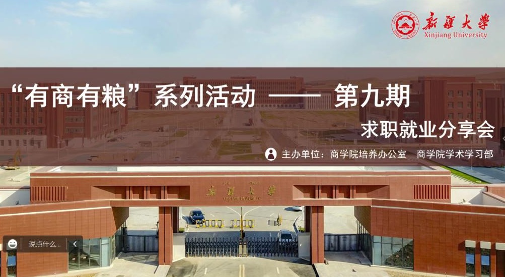 冰雪消融,草木初生。随着同学们返校后慢慢适应新疆大学研究生生活,有商有粮系列活动也在一片热烈反响中开始了新的篇章。为了增强学生的生涯规划与职业发展意识,引导学生树立正确的就业观、择业观,提升学生就业能力,帮助广大学生解答求职就业方面的疑惑,2023年3月16日晚上20:00,新疆大学商学院培养办公室、研究生分会学术学习部通过线上腾讯会议的方式,开展了有商有“粮”活动第九期——求职就业分享会,意在从企业面试官的视角出发,聚焦于求职就业的介绍与面试经验分享,帮助同学们在求职招聘面试过程中少走弯路。商学院党委副书记潘勇承老师,培养办主任张力老师和常雯青老师出席了本次活动,近200名研究生参加了此次活动。