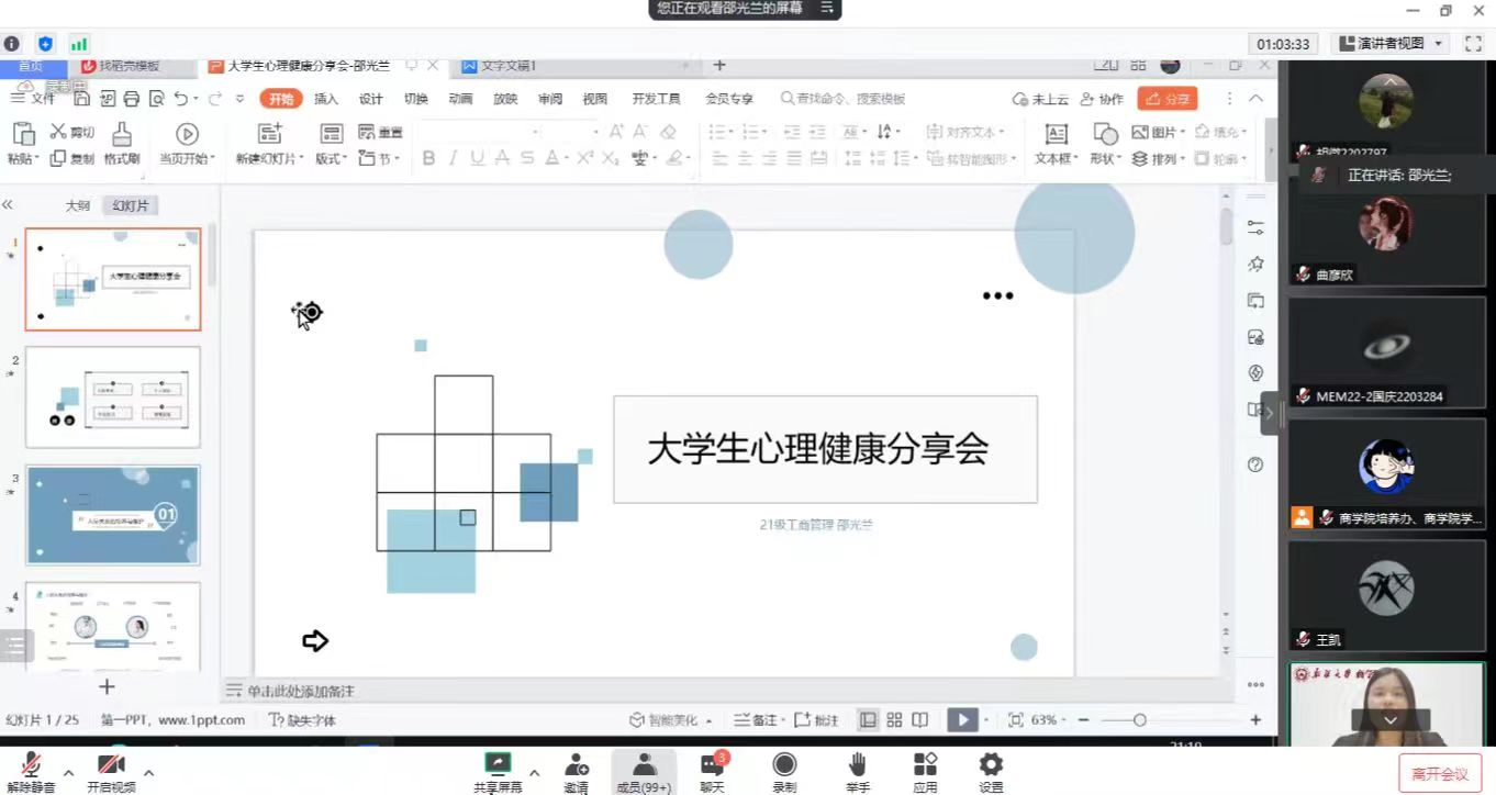 最后,由邵光兰同学从人际关系的培养及维系、研一的个人规划、学业压力的化解以及情绪管理四个方面进行了宝贵的分享,希望同学们能够更加注重心理健康,合理安排学习、实习工作与生活。另外,她还向同学们展示了自身的研究生学习生活经历,引起同学们在研究生学业生活期间的共鸣,帮助同学们在研究生学业生活压力下保持健康的心理状态。