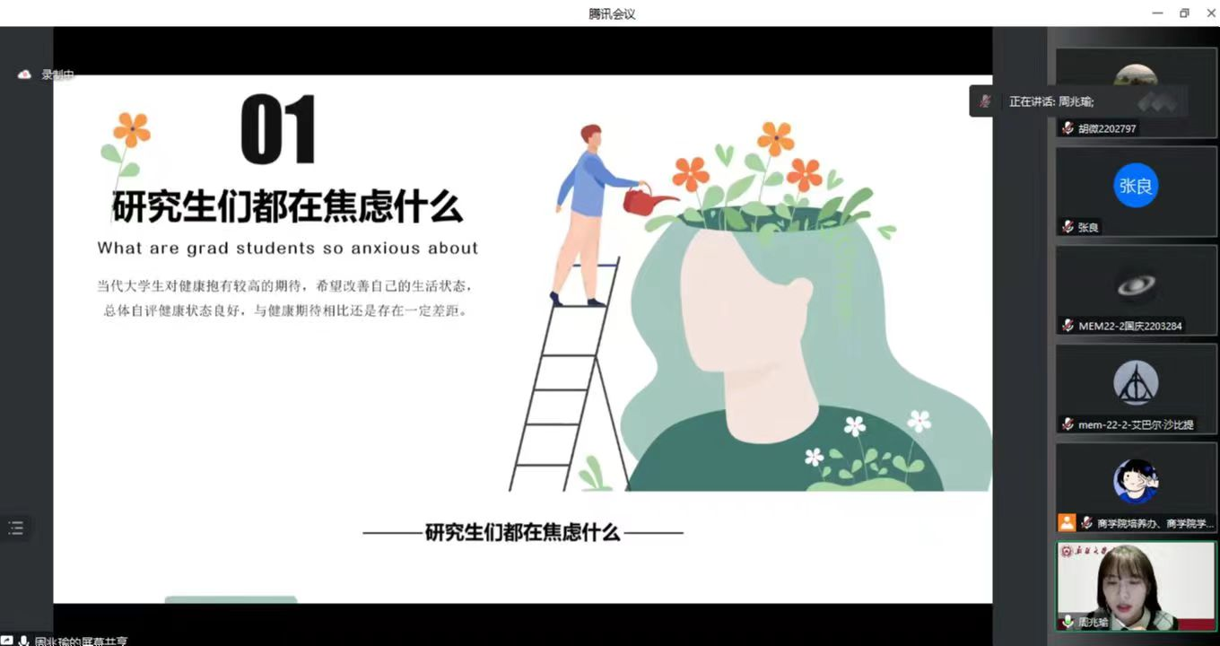 目前,由于大学生的心理问题往往会影响其在各方面的发展,国家因此高度关注大学生心理健康教育,为进一步加强我院研究生心理健康教育,帮助我院研究生正确疏导学业压力,增强人际关系处理能力,提高心理健康素养及抗压能力,2023年4月27日晚上20:30,新疆大学商学院培养办公室、研究生分会学术学习部通过线上腾讯会议和钉钉同步直播的方式,开展了有商有“粮”活动第十一期——大学生心理健康分享会,意在通过朋辈分享,引导同学们保持健康良好的心理状态。商学院党委副书记潘勇承老师,培养办主任张力老师和常雯青老师以及2022级全体全日制学生参加了此次活动。