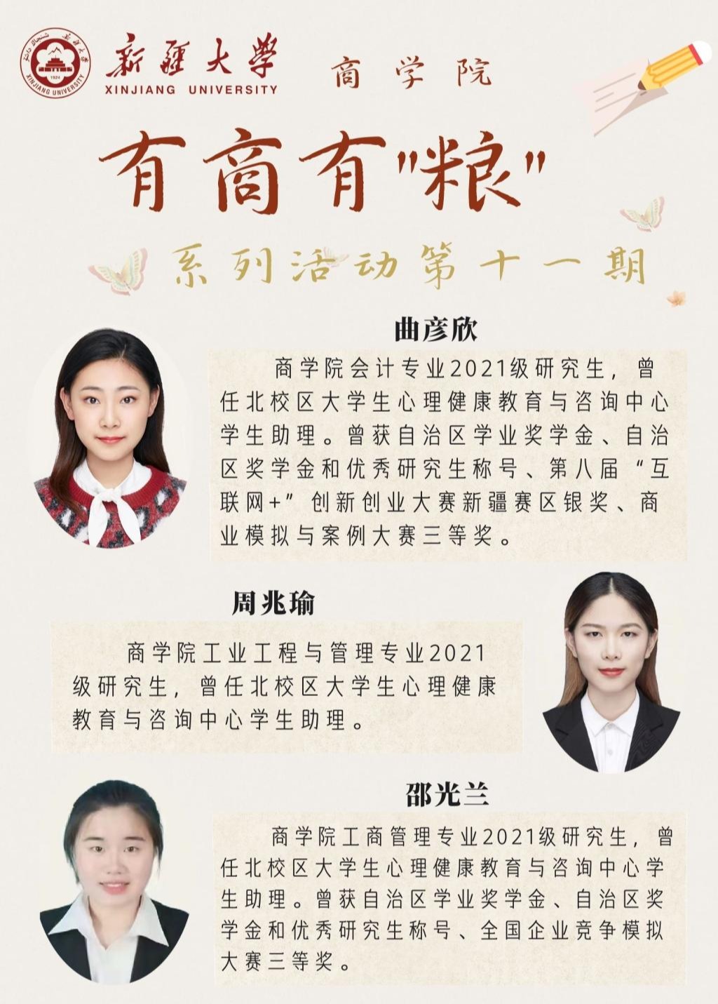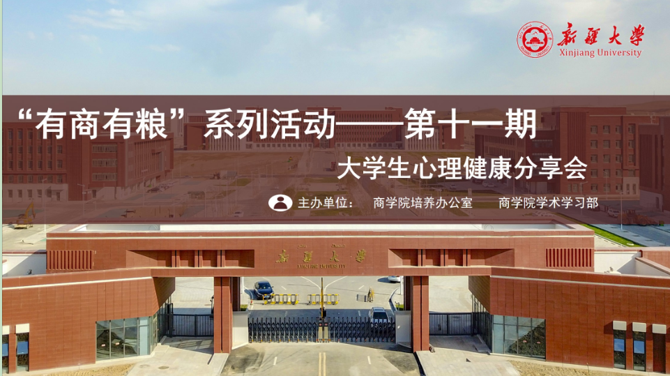 有商有“粮”系列活动将延续系列活动的宗旨,为同学们提供研究生学习生活的交流平台,希望通过本次分享会的实时交流能够帮助同学们将自身认知、情感、行为三个方面进行有效结合,把习得的心理健康教育知识或技能在学习、人际交往、恋爱、就业等方面学以致用,从而获得自我调节和解决实际心理问题的能力。