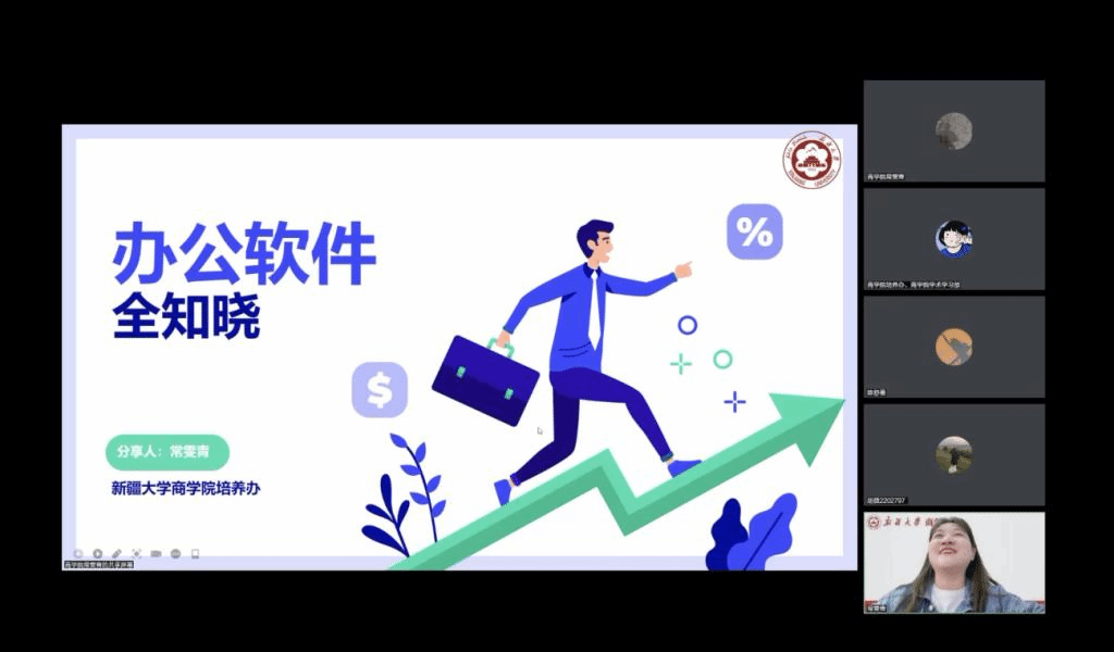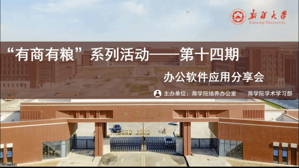 工欲善其事,必先利其器,在学术研究与工作生活方面,大学生除必须掌握专业知识以外,还应该熟悉掌握办公软件应用这一基本技能。为了进一步加强我院研究生办公软件应用能力与日常数据处理能力,提高学术研究与专业实践的综合素质,推动高校高素质人才培养计划的落实,提高研究生高质量创业就业竞争力,2023年6月1日晚20:30,新疆大学商学院培养办、研究分会学术学习部联合开展了2023学年有商有“粮”系列活动第十四期——办公软件应用分享会。商学院院长吕雁琴老师以及商学院培养办主任张力老师出席了本次活动,我院各专业研究生参加了本次会议。