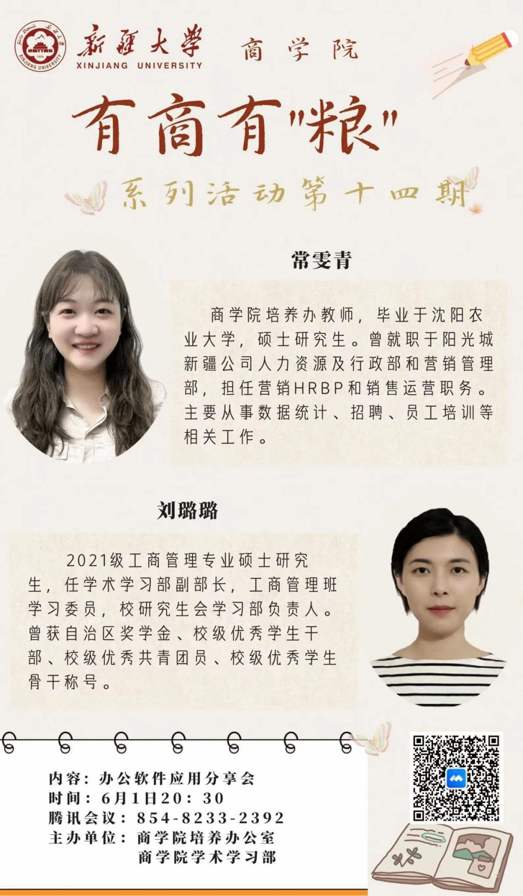 本次分享两位嘉宾分别是商学院培养办教师常雯青老师和2021级工商管理专业研究生刘璐璐同学。常雯青老师是毕业于沈阳农业大学的硕士研究生,目前是新疆大学商学院培养办老师,曾就职于阳光城新疆公司人力资源及行政部和营销管理部,曾担任营销HR和销售运营职务,主要从事数据统计,招聘,员工培训等相关工作。而刘璐璐同学是新疆大学商学院工商管理专业2021级硕士研究生,现任新疆大学研究生会学习部负责人、商学院学术学习部副部长,还是工商管理21级2班学习委员,曾获自治区奖学金和校级优秀学生干部、校级优秀共青团员、校级优秀学生骨干称号。