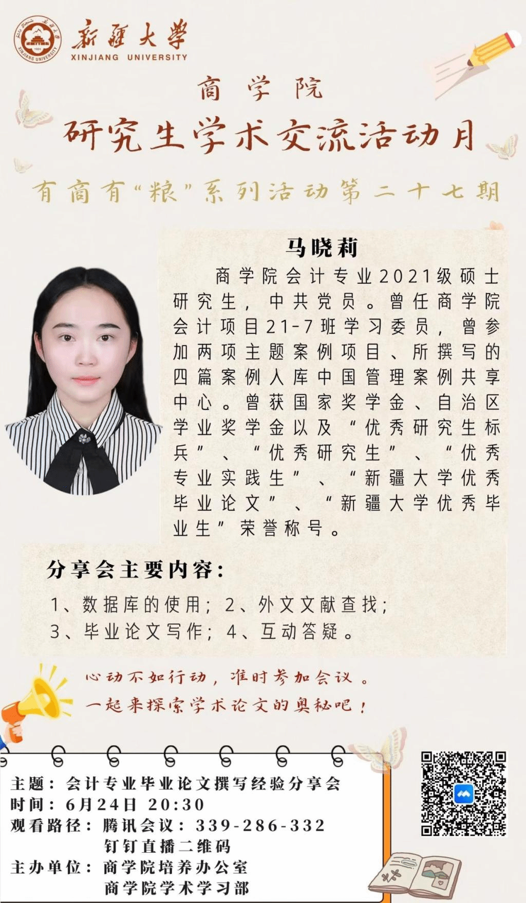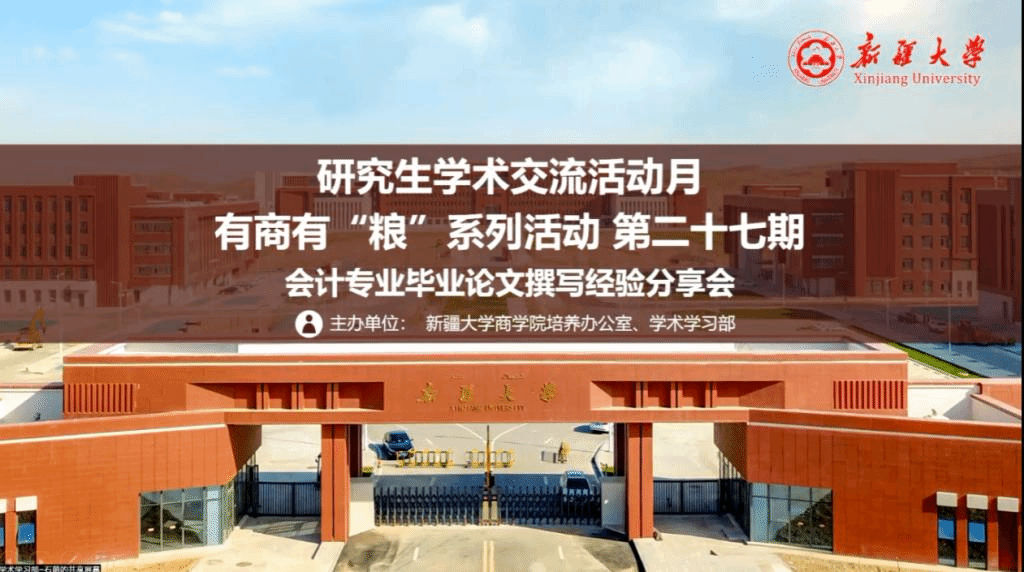 “文海泛舟寻真理,笔耕不辍获新知”。在毕业论文写作过程中,如何选择合适的论文题目、进行有效的研究、组织论文结构、管理分配时间、解决写作中可能遇到的问题,如何与导师有效沟通、利用学校资源和图书馆资料,其中的每一步对同学们来说都至关重要。为促进同学们在论文写作方面的交流与学习,解决同学们在论文选题与写作过程中的问题,以及提升同学们的学术研究能力、营造良好的学术氛围,助力同学们共同探讨、钻研并汲取撰写毕业论文的经验。2024年6月24日晚20:30,新疆大学商学院培养办公室、研究生分会学术学习部通过线上腾讯会议与钉钉转播的方式,组织开展了有商有“粮”系列活动第二十七期——会计专业毕业论文撰写经验分享会。此次活动由国纪东同学主持,全院四百余人观看直播。