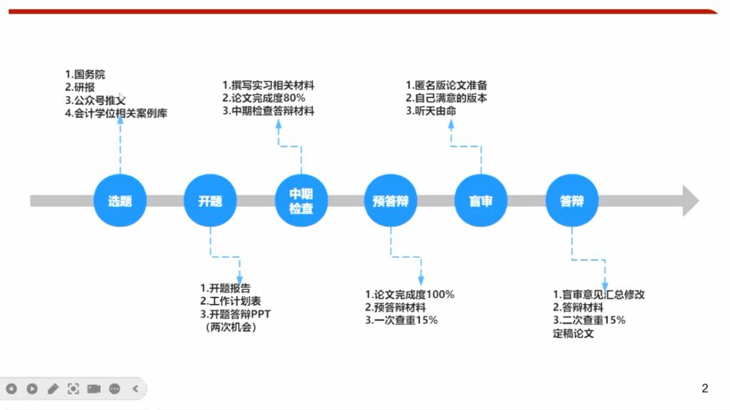 马晓莉同学的分享内容聚焦于如何撰写会计专业硕士学位论文,分别从选题、开题、中期检查、预答辩、盲审、答辩六个方面进行介绍与分享。首先,马晓莉同学介绍了论文写作中的研究背景与行业研报选择。在选择研究背景时,可以从国家出台的中央政策文件中寻找与研究方向相关的内容;而在选择行业研报时,可以参考东方财富网等网站,根据自己的研究方向和实习单位提供的财务数据进行选择,同时提醒同学们在撰写论文摘要时,要注意有数据支撑,避免数据堆砌。而在介绍案例企业时,要关注企业的关键性特征,如市值、财务状况等,以及行业竞争态势和地位。