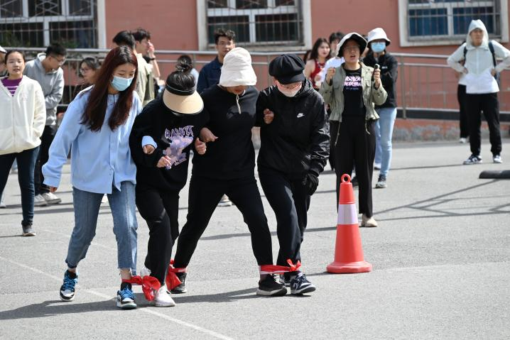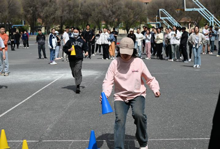 最后进行的两人三足比赛考验了同学们的平衡能力和团队协作能力。同学们四人结对,绑住相邻的腿,在比赛过程中互相扶持、共同前进。尽管中途有些队伍出现了绳子脱落或摔倒的情况,但他们迅速调整状态,继续比赛,展现了坚韧不拔的精神风貌。