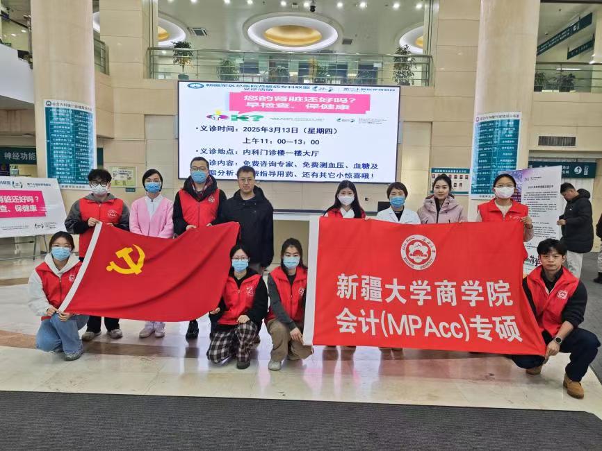 为深入学习贯彻习近平新时代中国特色社会主义思想,传承弘扬雷锋精神,3月13日新疆大学商学院会计研究生第九、第十党支部联合中国人民解放军新疆军区总医院开展“党旗飘扬志愿红,雷锋精神映天山”主题党日活动。本次活动采用“党建带团建”模式,特别邀请4名团员同学共同参与,与26名党员共同组成志愿服务队,赴军区总医院开展为期两天的志愿服务,以实际行动践行初心使命,彰显新时代青年党员团员的责任担当。