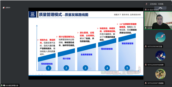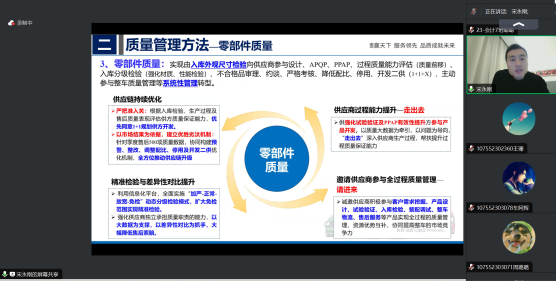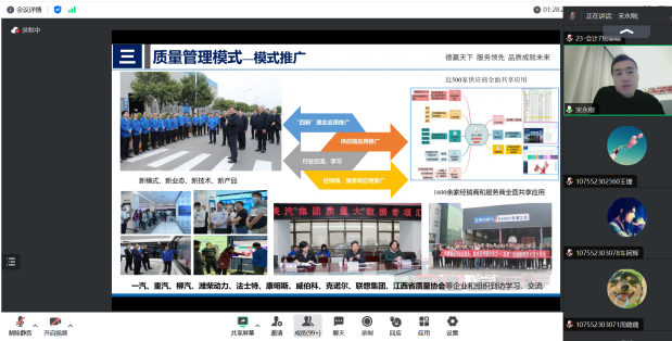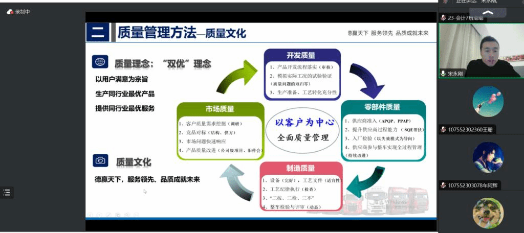 讲座伊始,宋永刚老师分别从产品创新、技术创新、模式创新、品牌建设等方面讲述了陕汽集团的发展历程和质量管理模式的创新情况。接着,宋老师以陕汽集团质量管理组织架构、质量文化、产品实现过程质量、质量数字化转型探索等方面内容为基底,重点阐释了陕汽集团质量管理方法及其市场质量控制、研发质量控制、零部件质量供应链控制、制造质量控制等质量控制的特色。最后,宋老师结合陕汽集团质量发展路线、质量管理模式基础与要素、“四新”引领,双循环、智能管理、模式推广等方面的特色,详细介绍了陕汽基于“四新”引领的双循环智能质量管理模式及其模型图,并进行了陕汽集团质量管理模式展望。