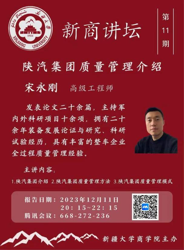 质量是企业生存和发展的第一要素,高质量产品是企业的生存之根、发展之本、竞争之力。为促进学生进一步认识质量管理模式创新及其对企业的重要性,提高学院研究生的综合素质,了解企业的发展趋势,12月11日20时,商学院第11期“新商讲坛”学术交流分享系列活动邀请陕汽集团质量管理部部长宋永刚高级工程师开展“四新引领 智能双循环质量管理模式创新”主题讲座。本次讲座由商学院党委委员、副院长宋凌峰主持,刘书庆教授做点评嘉宾,学院全体研究生聆听学习。