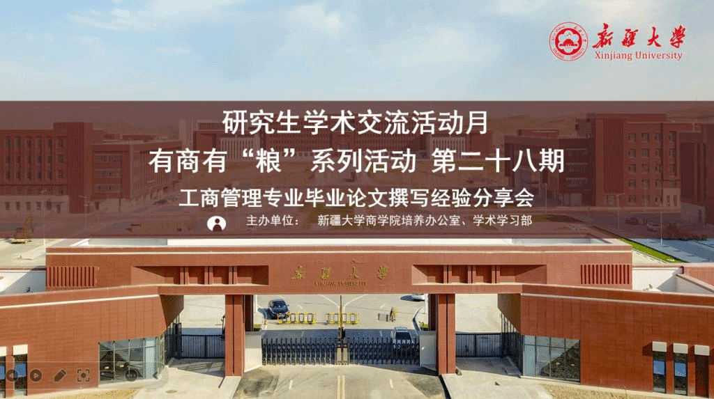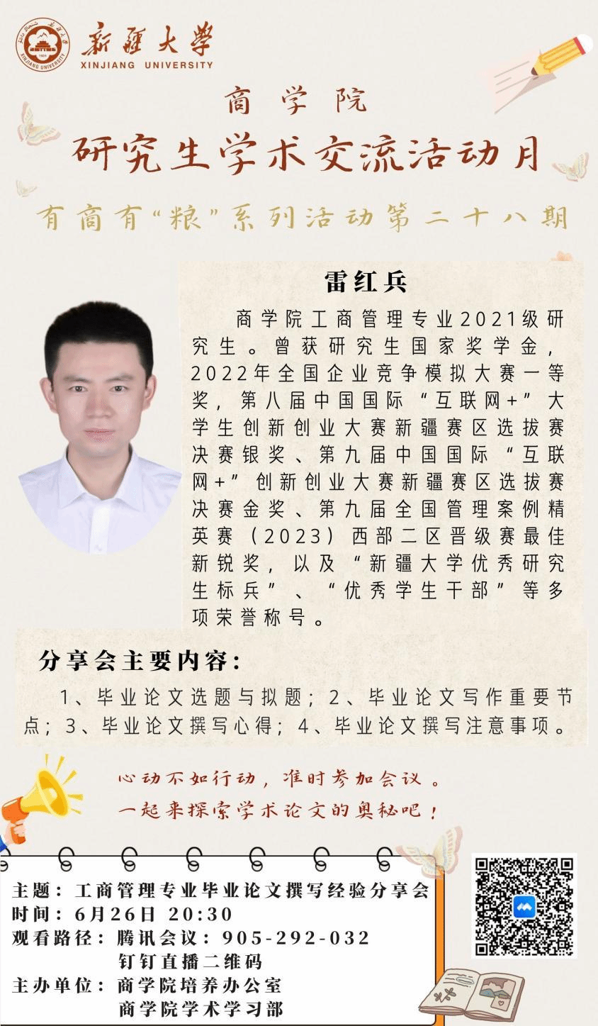 “青春行进,芳华待灼,砥砺深耕,履践致远”。在毕业论文写作过程中,如何确定选题、研读文献、研究问题,如何保证科学的研究方法、连贯的行文结构、完善的论文终稿,对于同学们完成一篇学位论文而言都至关重要。为促进同学们在论文写作方面的交流与学习,解决同学们在论文选题与写作过程中的问题,进而帮助同学们提升专业研究能力、锻造学术钻研精神,助力同学们共同交流并吸收撰写毕业论文的经验。2024年6月26日晚20:30,新疆大学商学院培养办公室、研究生分会学术学习部通过线上腾讯会议与钉钉转播的方式,组织开展了有商有“粮”系列活动第二十八期——工商管理专业毕业论文撰写经验分享会。此次活动由王睿璇同学主持,全院二百余人观看直播。