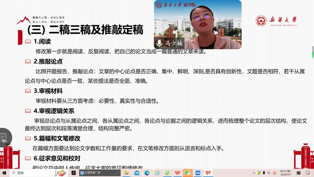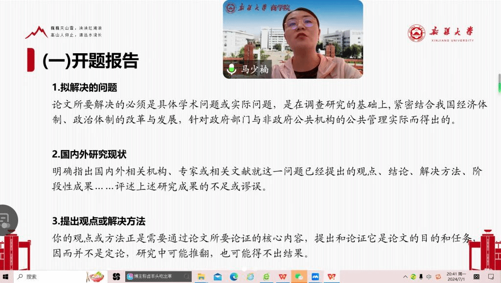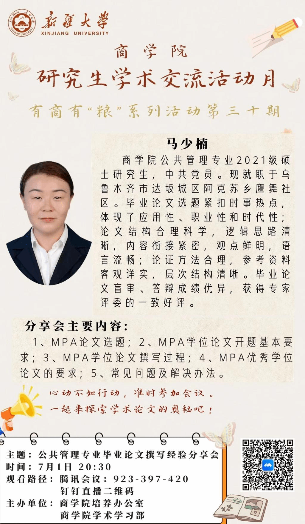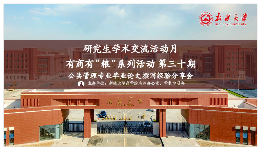 “论文撰写前路漫漫,经验分享引领前行"。在当前公共管理领域知识不断更新的背景下,研究生们不仅要夯实专业理论之基,更应通过毕业论文撰写的经验分享,来增强实际操作能力,拓宽学术视野。公共管理专业的毕业论文撰写,不仅是对储备知识与实践效果的检验,更是迈向专业精英的重要里程碑。为促进公共管理学术研究的深入交流,强化理论与实际操作的紧密结合,激发同学们的研究热情和实践能力,2024年7月1日晚20:30,新疆大学商学院培养办公室、研究生分会学术学习部联合举办了有商有“粮”系列活动第三十期——公共管理专业毕业论文撰写经验分享会。此次活动特邀马少楠同学担任主讲嘉宾,全院近百名学生齐聚一堂,共同汲取撰写毕业论文的宝贵经验。