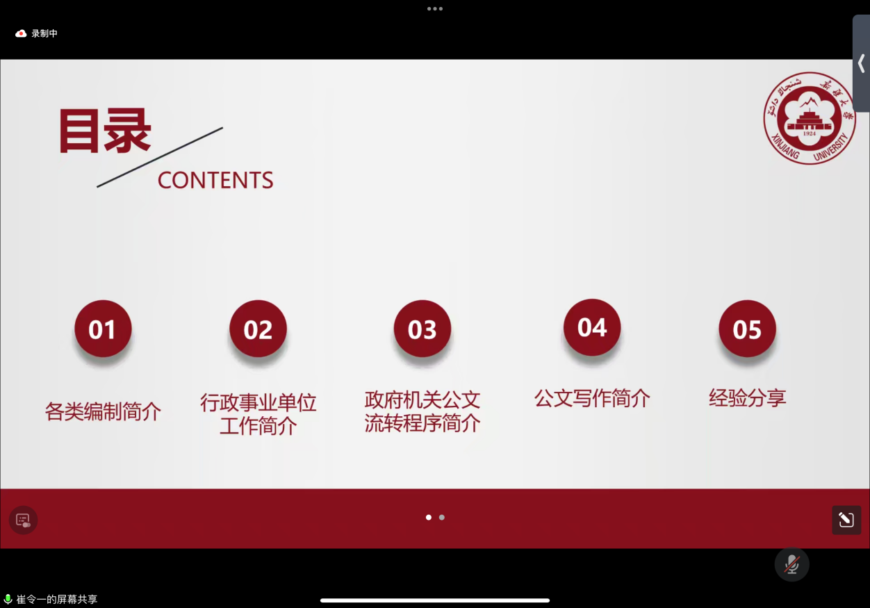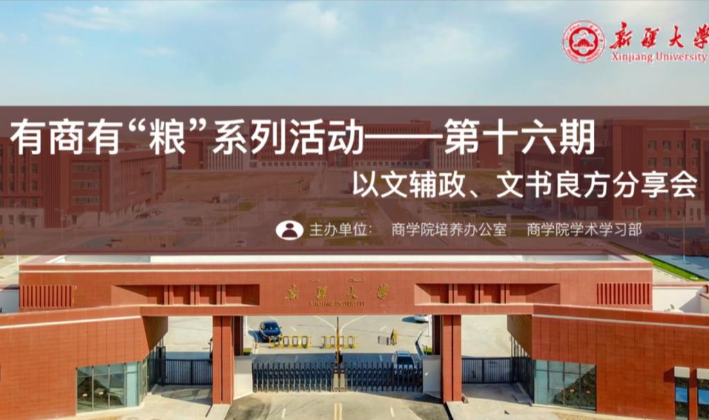 “水榭听风笔下情,文字流转意蕴浓”,为进一步拓展同学们的综合素质,提高公文写作水平,提高公文写作效率,为以后的职业生涯奠定良好的基础,2023年10月19日晚上20:30,新疆大学商学院培养办公室、研究生分会学术学习部通过线上腾讯会议的方式,组织开展了2023学年有商有“粮”系列活动第十六期以文辅政、文书良方分享会。本次活动主要邀请了张力老师,白洁老师和常雯青老师出席,并由崔令一同学主讲、谭欣苗同学主持,全院一百三十余人参加会议,由于腾讯会议人数设置有限,很多同学遗憾未能参加活动。