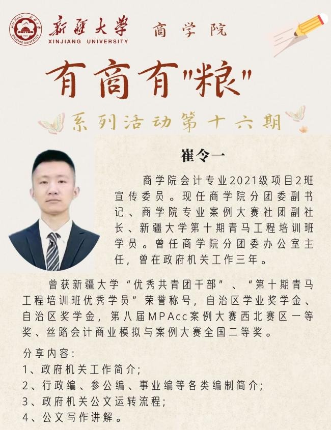 本次主讲嘉宾是崔令一同学(会计专业2021级硕士研究生),曾任商学院分团委办公室主任;现任商学院分团委副书记、商学院会计21-2班宣传委员、学院专业案例大赛社团副社长。曾获新疆大学优秀共青团干部、第十期青马工程培训班优秀学员荣誉称号,自治区学业奖学金、自治区奖学金。曾荣获第八届MPAcc案例大赛西北赛区一等奖、丝路会计商业模拟与案例大赛全国二等奖。也曾在政府机关工作过三年,是名副其实的“笔杆子”。