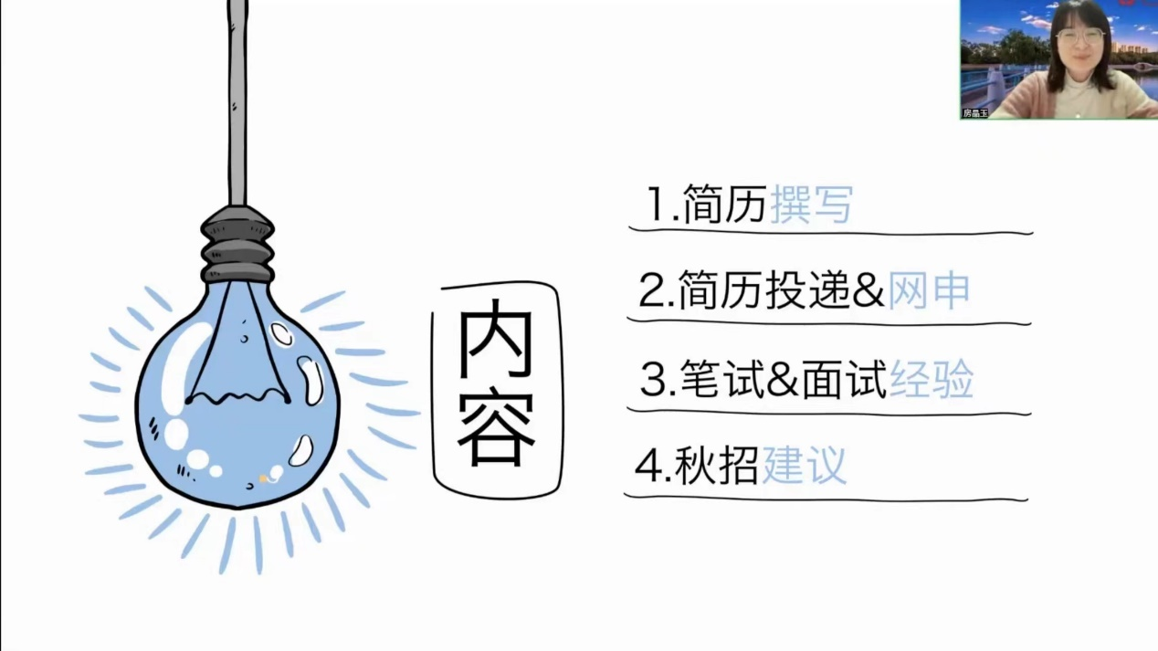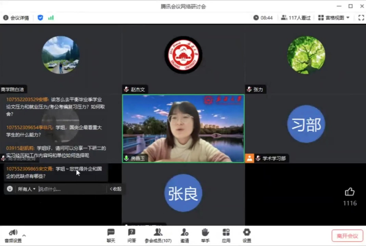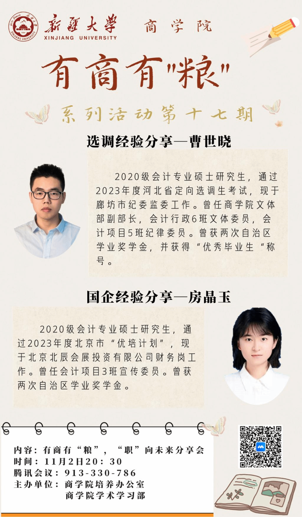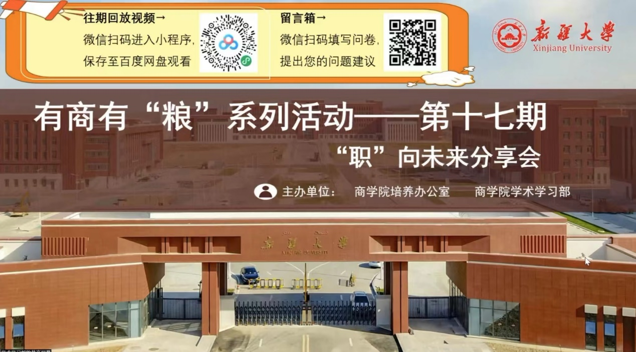 “少年当立凌云志,奋进逐梦揽星辰”。为引导学生树立正确的就业观、择业观,增强我院研究生的生涯规划与职业发展意识,2023年11月2日晚上20:30,新疆大学商学院培养办公室、研究生分会学术学习部通过线上腾讯会议的方式,组织开展了2023学年有商有“粮”系列活动第十七期 “职”向未来分享会,意在提供可借鉴的求职经验和就业技巧,帮助同学们更好地应对就业挑战。商学院党委副书记、纪检书记潘勇承老师、培养办主任张力老师、培养办常雯青老师和白洁老师出席本次活动,并由商学院分团委副书记、学工办赵杰文老师、商学院会计专业2020级硕士研究生曹世晓同学和房晶玉同学主讲,张良同学主持,全院百余人参加了此次活动。