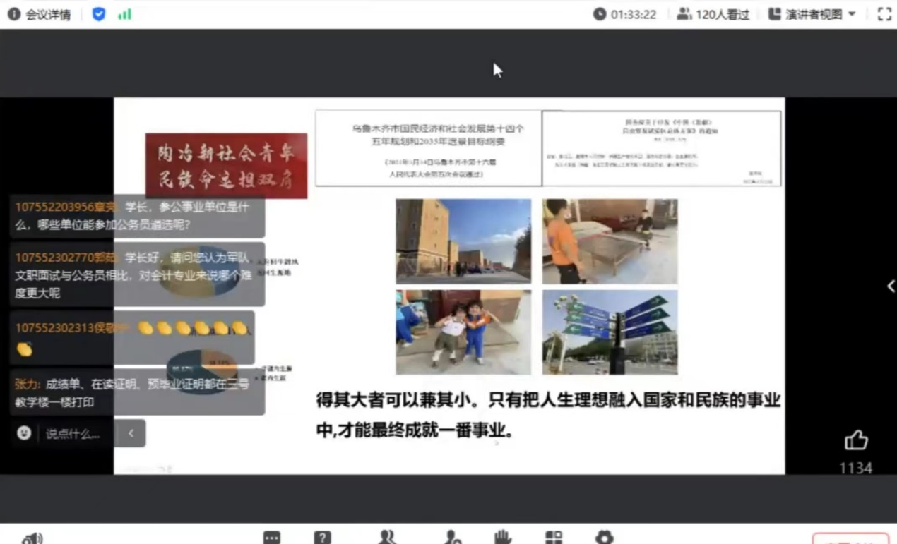 第三位主讲嘉宾是赵杰文老师(新疆大学商学院分团委副书记、学工办老师)。赵杰文老师指出“凡事预则立,不预则废”,重点强调了职业规划的重要性。首先,他认为职业规划要在思想上破题。意识到职业规划的重要性,选择适合自己的岗位比盲目努力更重要;其次,他认为职业规划要在行动上发力。“先起飞再调整方向,先起跑再调整呼吸”,从现在开始,珍惜在校时光,脚踏实地,在实习中成长、在实践中完善;最后,他指出“天下之事,总是困于想,而破于行”,希望同学们通过此次分享会,了解实习、就业的经验,树立正确的择业观,以明确的目标促进具体的行动,久久为功,终将抵达梦想的彼岸。