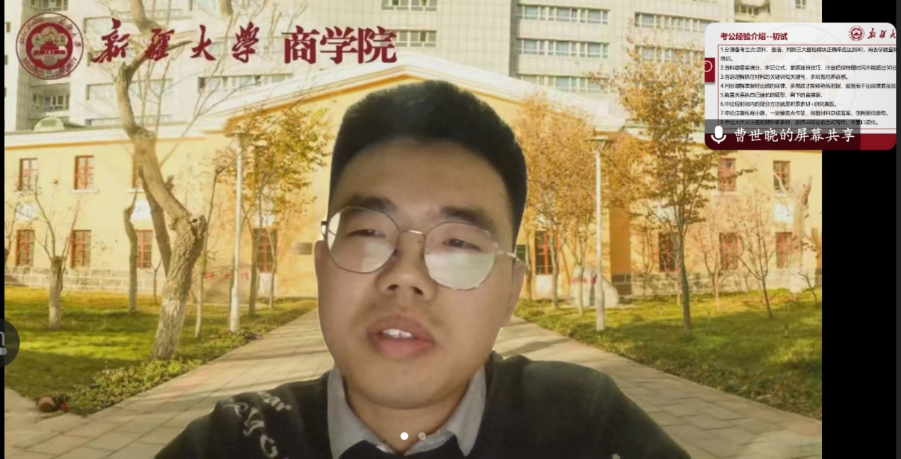 第二位主讲嘉宾是曹世晓同学(会计专业2020级硕士研究生),曾任商学院文体部副部长,并获两次自治区学业奖学金以及“优秀毕业生”称号。曹世晓同学的分享内容侧重于考公经验和央国企就业两个方面。首先,曹世晓同学向同学们讲述自己的上岸过程与经验,告诫大家一定要脚踏实地,努力提高专业技能水平;其次,他向同学们着重讲解考公经验,并向同学们介绍因地域和企业类型差异所导致的企业整体待遇和发展前景的不同。他强调,在现阶段学习中,要笃学不倦,通过刷题培养语感,注重语言理解,抓住材料的关键点。此外,还需加强素材阅读和积累,养成良好的写作习惯,按照标准的三段论方式书写;最后,他还建议大家利用好碎片化的时间,将理论和实践相结合,知行合一、敏而好学!