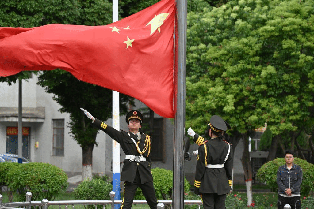 在晨光中,国旗班成员迎着朝阳,步伐铿锵有力,向升旗台稳健走去。激昂的国歌声响起,鲜艳的五星红旗在众人的注视下冉冉升起,随风飘扬。