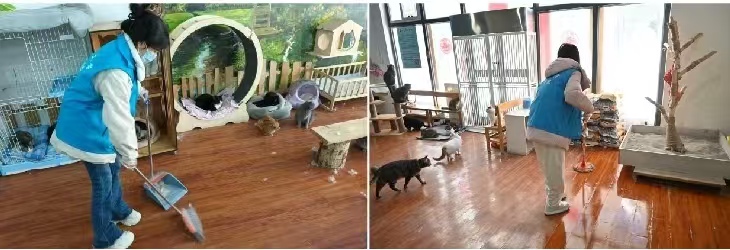 到达活动现场后,志愿者们领取清洁工具,佩戴好口罩和手套,了解注意事项后迅速投入清扫工作。大家分工协作、相互配合,每个人都尽职尽责,认真清洁每个角落,确保不遗漏任何垃圾,力求为流浪动物们提供一个更加温馨、干净的生活环境。最终,在轻松愉快的氛围中,地面打扫、猫砂清理、猫用具清洗、垃圾清倒等目标顺利达成。志愿者们表示每一片干净的土地,都是对生命的尊重与守护。