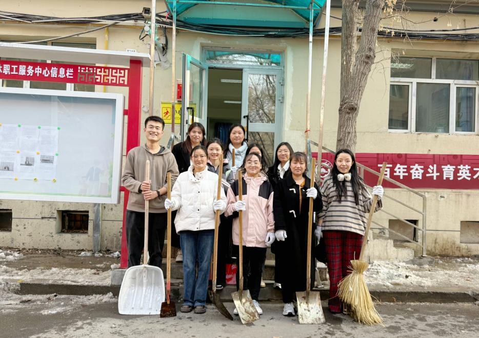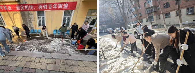 在张媛媛老师的带领下,志愿者们到达活动地点。经过简要的工作内容说明和注意事项讲解后,大家迅速按照既定计划分组展开行动,同时同步开展西院与北院活动中心的积雪清扫任务。
