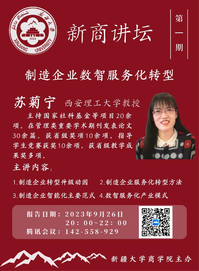 国家制造强国战略明确提出:“要以加快新一代信息技术与制造业深度融合为主线,以推进智能制造为主攻方向,实现制造业由大变强的历史跨越。”为使学生紧跟国家发展战略方向,塑造新时代背景下的核心竞争力,洞察制造业与信息管理深度融合的行业风口,9月26日20时,新疆大学商学院举办了2023-2024学年“新商论坛”学术交流分享系列活动第一期——制造企业数智服务化转型讲坛,并邀请西安理工大学教授苏菊宁作为主讲老师。本次讲座由学院党委委员、副院长宋凌峰主持,刘书庆教授做点评嘉宾,学院全体研究生聆听学习。