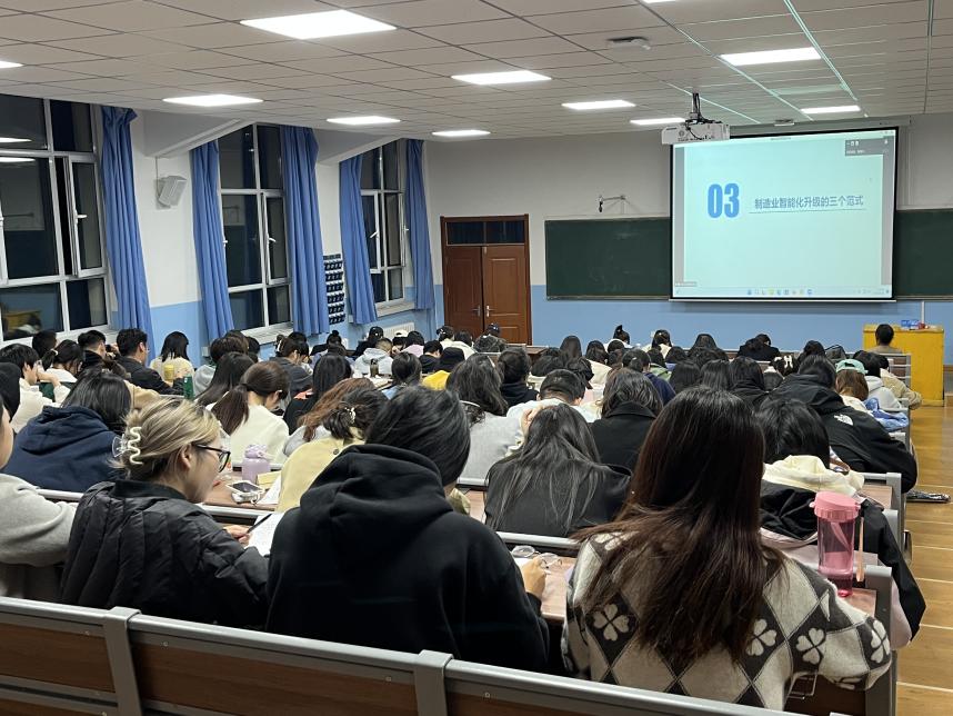 苏菊宁教授从转型升级的动因、服务化转型方向、智能化升级主要范式以及数智服务化模式四个模块,对数智服务化转型进行了系统化阐述。讲座伊始,苏教授通过讲述制造系统发展阶段,揭示了制造企业转型升级的动因。紧接着,苏教授结合陕西鼓风机(集团)有限公司全生命周期系统服务和三一重工股份有限公司等案例,讲述了制造企业服务化转型的方法,指出“服务化悖论”现象的存在,并将制造企业智能化三个基本范式的转换逻辑深入浅出地呈现在同学们面前。之后,苏教授分享了自己对数智服务化模式独到的见解,总结出了产品健康保障服务、效能增值服务等智能化服务模式,加深了学生对制造企业数智服务化转型的了解。