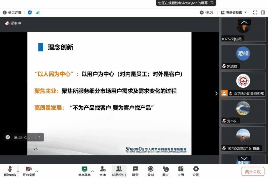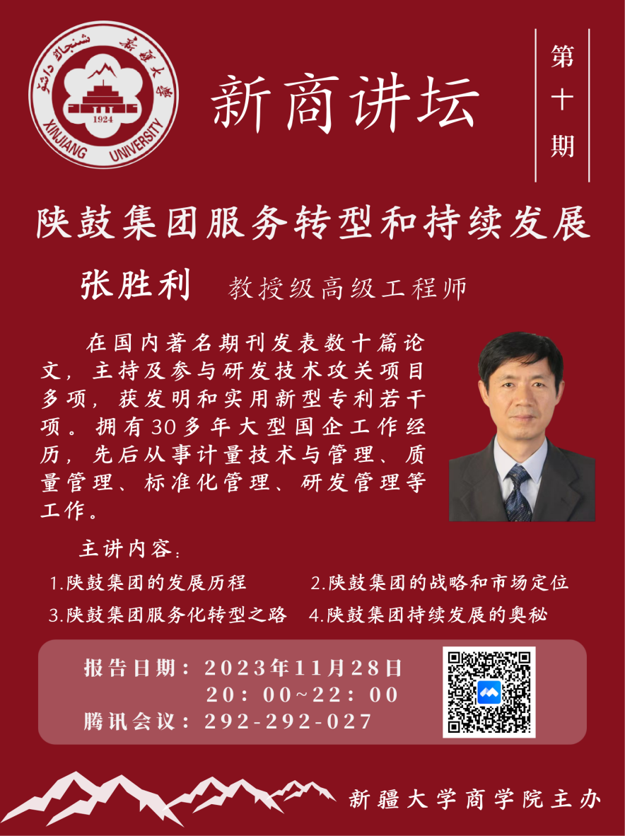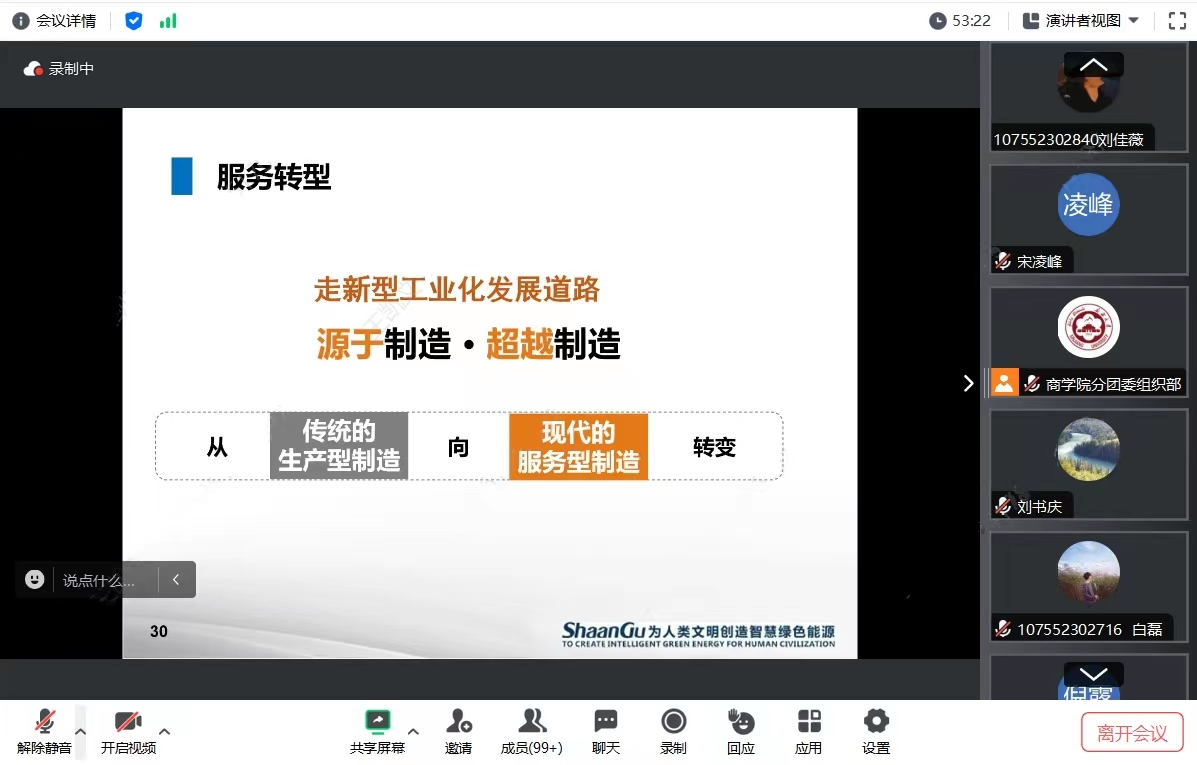 “十四五”规划和2035年远景目标纲要提出:“发展服务型制造新模式,推动制造业高端化智能化绿色化。”为助力学生紧跟企业转型的发展浪潮,了解企业新发展趋势,11月28日20时,商学院第10期“新商讲坛”学术交流分享系列活动邀请陕鼓集团教授级高级工程师张胜利老师开展“陕鼓集团服务转型和持续发展”主题讲座。本次讲座由商学院党委委员、副院长宋凌峰主持,刘书庆教授做点评嘉宾,学院七百余名研究生聆听学习。