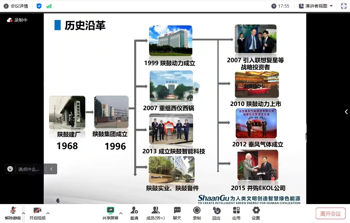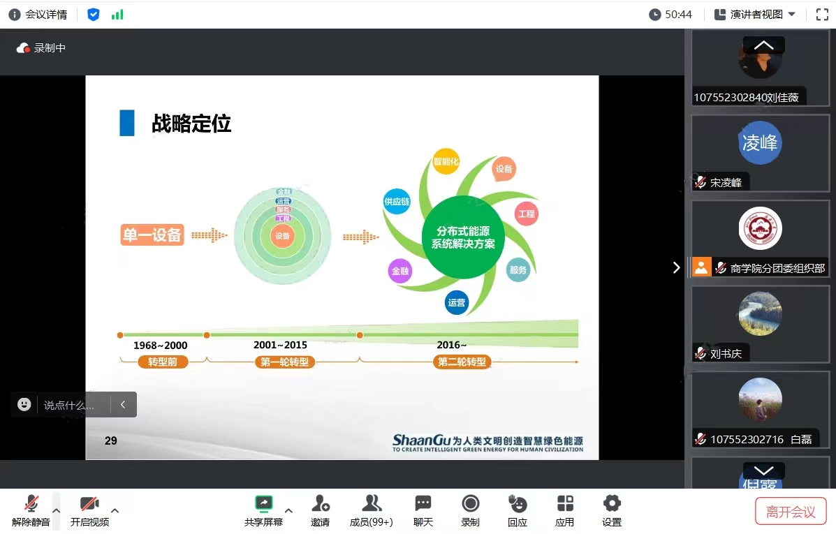 张胜利老师在讲座中回顾陕鼓集团从传统生产型制造企业成为典型服务型制造企业的发展历程,基于陕鼓集团的战略和市场定位,总结出集团的三个转型阶段成果,即从单一产品制造商向分布式能源领域系统解决方案提供商和系统服务商转变;从产品经营向客户经营、品牌经营和资本运营转变;聚焦于分布式能源市场,打造世界一流智慧绿色能源强企。