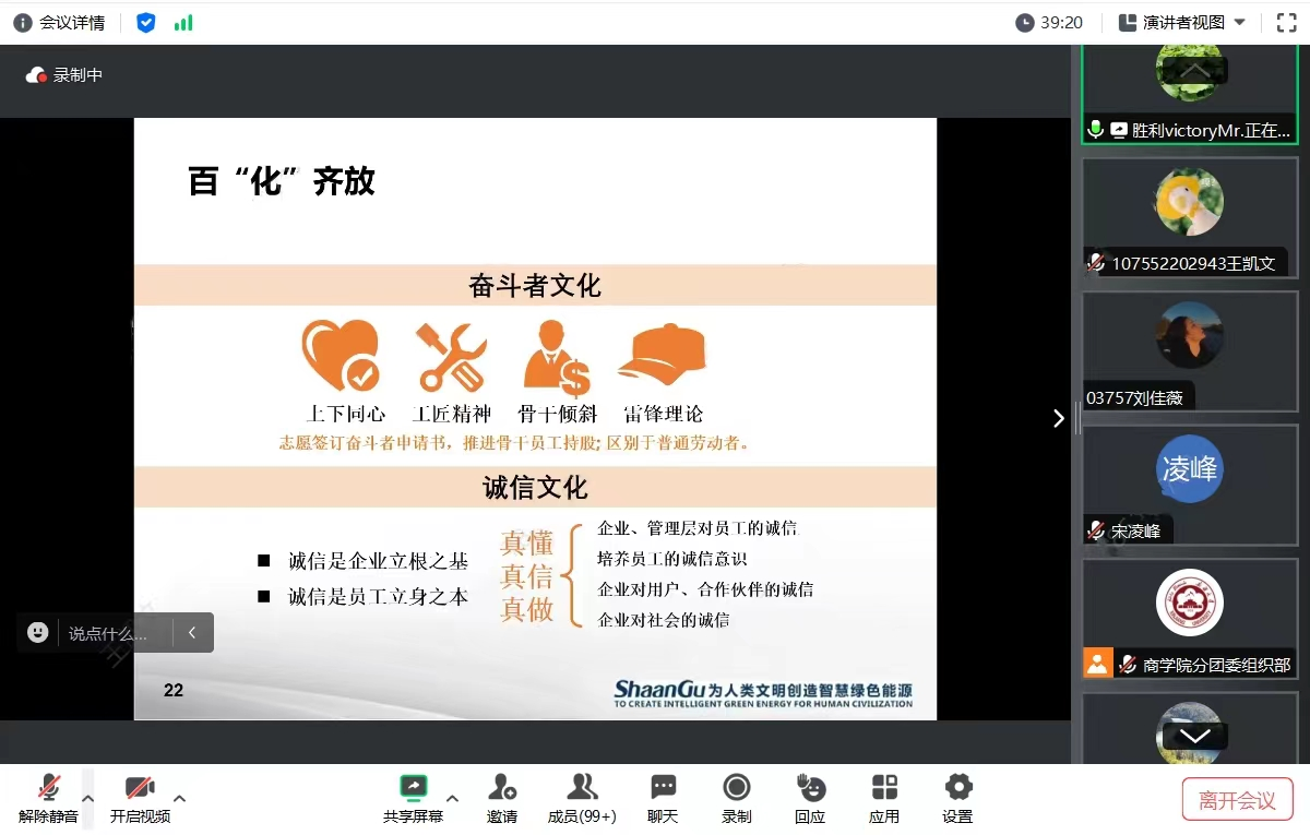 最后,刘书庆教授对讲座内容进行了总结点评,进一步为同学们理清了陕鼓集团服务化转型的创新成果与成功经验,并希望同学们深刻理解“服务型制造”的内涵与运营模式,将陕鼓集团百“化”齐放的企业文化实践案例与专业理论相贯通,运用于以后的职业生涯发展中,提高自身的综合能力。