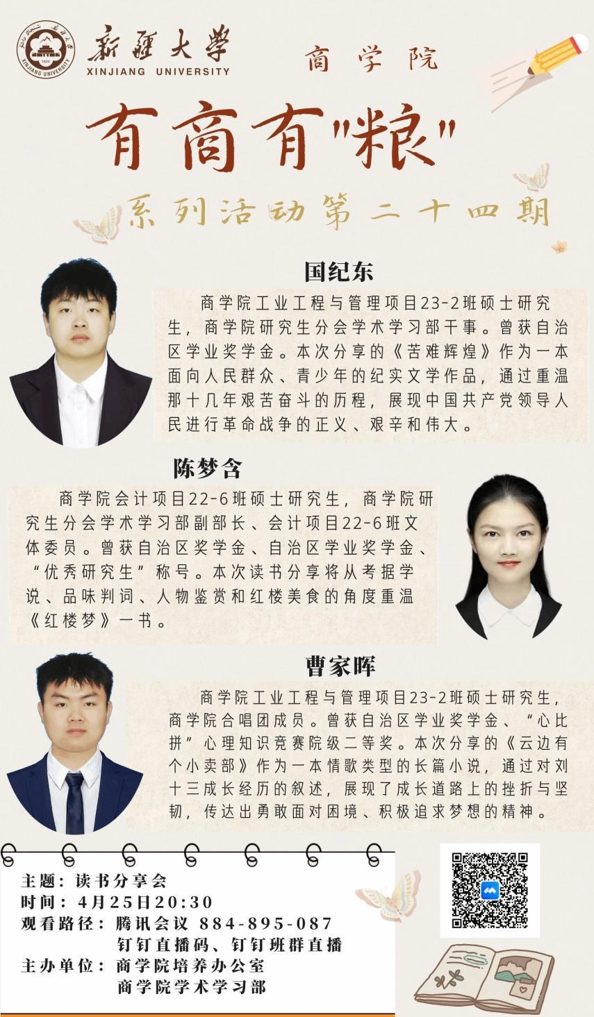 “立身以立学为先,立学以读书为本”。在书的世界里,我们可以跨越时空,对话先贤,洞察古今;可以驰骋想象,翱翔知识天宇,探索未知边界。联合国教科文组织将每年4月23日设立为“世界读书日”,在这个信息爆炸的时代,我们更应静心捧读,让书香浸润生活,让思考伴随阅读。为颂扬阅读力量,激发同学们对书籍与知识的热爱,2024年4月25日晚20:30,新疆大学商学院培养办公室、研究生分会学术学习部通过线上腾讯会议与钉钉转播的方式,组织开展有商有“粮”系列活动第二十四期——读书分享会。本次活动邀请到商学院院长吕雁琴老师、商学院培养办主任张力老师、商学院培养办常雯青老师和白洁老师出席,由国纪东、陈梦含、曹家晖三位同学主讲,龙康敏同学主持,全院六百余人观看直播会议。