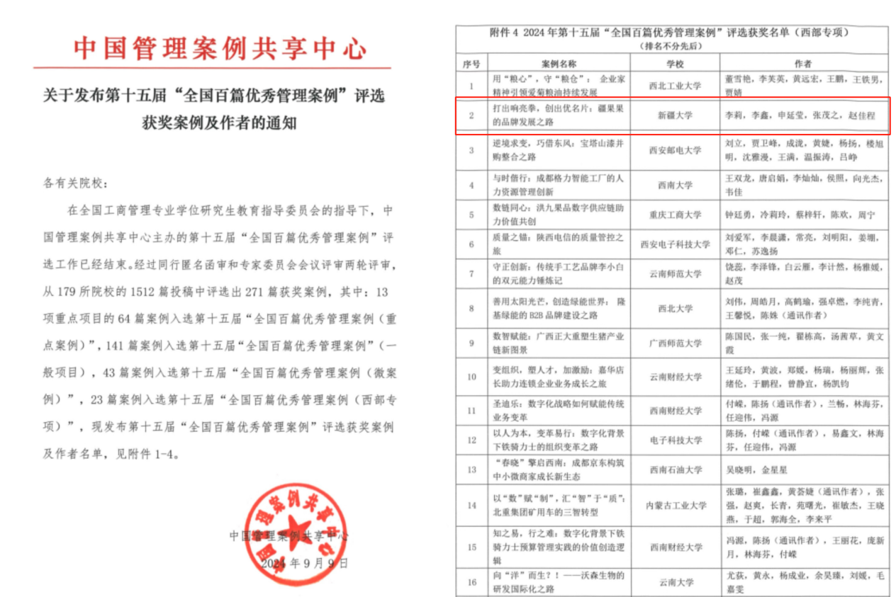金秋的九月,是硕果累累收获的季节。近日,中国管理案例共享中心发布了《关于发布第十五届“全国百篇优秀管理案例”获奖案例及作者的通知》,我校经济与管理学院李莉教授指导商学院会计硕士研究生李鑫、申延莹、张茂之和赵佳程开发的《打出响亮拳、创出优名片:疆果果的品牌发展之路》案例荣获第十五届“全国百篇优秀管理案例(西部专项)”,这是我校案例连续第三年入选该中心“全国百篇优秀管理案例”。