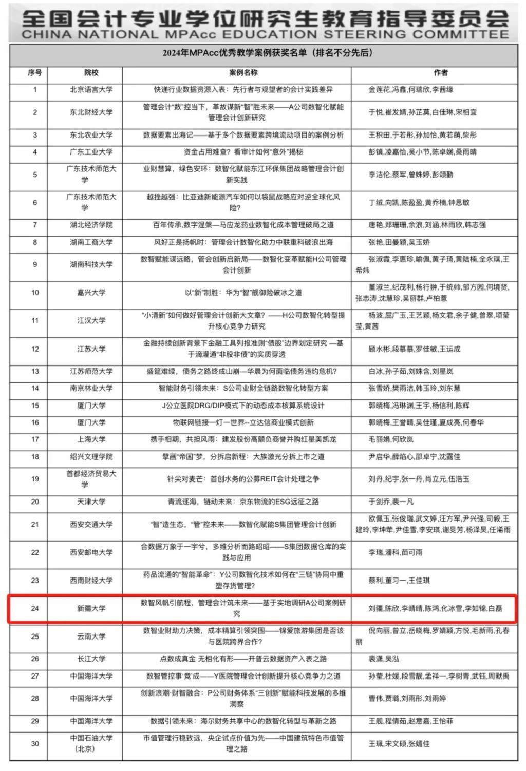 近日,MPAcc优秀教学案例组织委员会公布了《2024年会计硕士专业学位优秀教学案例评选结果》。我校刘疆教授团队撰写的教学案例《数智风帆引航程,管理会计筑未来——基于实地调研A公司案例研究》入选全国MPAcc优秀教学案例库,并斩获优秀教学案例奖。