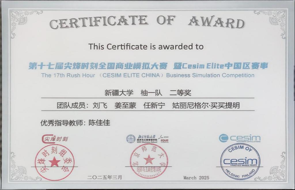 第十七届“尖烽时刻”全国商业模拟大赛总决赛于2025年3月28日至3月30日在北京师范大学成功举办。新疆大学商学院在本届赛事中表现优异,共斩获1项全国二等奖和8项全国三等奖,创下我院在该项赛事中的历史最佳成绩。